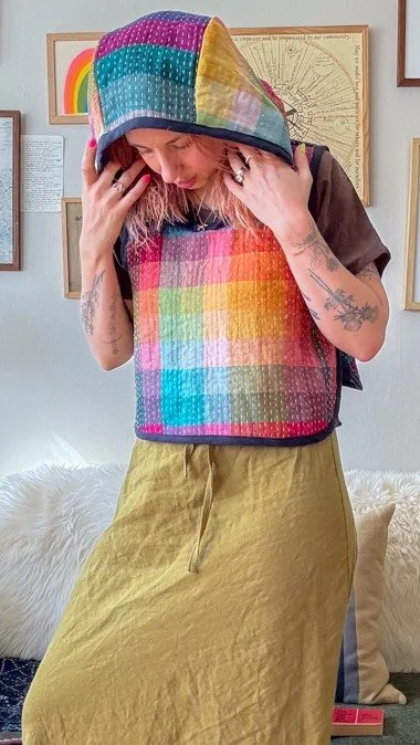 A digital sewing pattern inspired by chainmail hoods, helmets, and heraldry-adorned tabards worn by knights of ye olde times, but made of soft, squishy, warm quilted fabric.