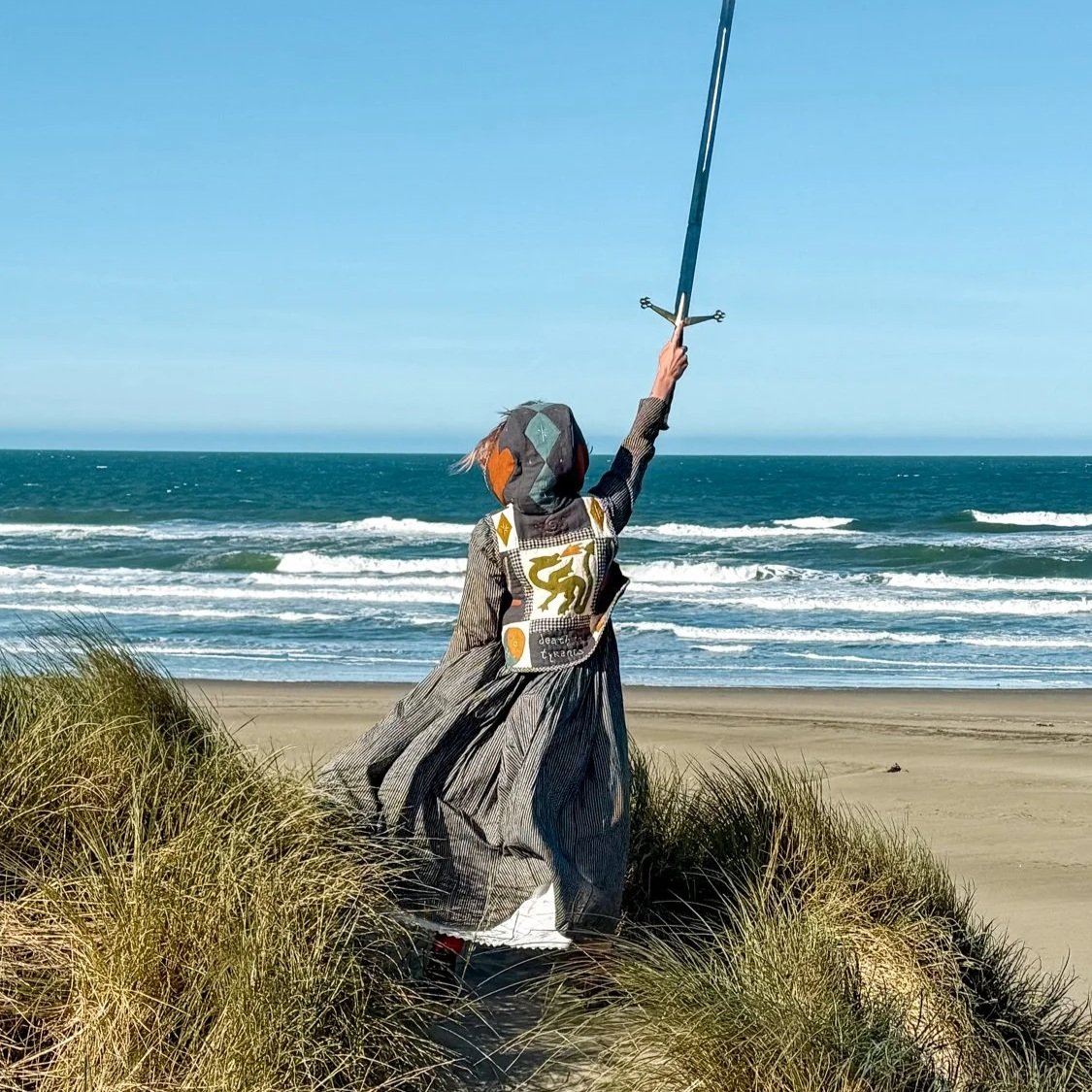 A digital sewing pattern inspired by chainmail hoods, helmets, and heraldry-adorned tabards worn by knights of ye olde times, but made of soft, squishy, warm quilted fabric.
