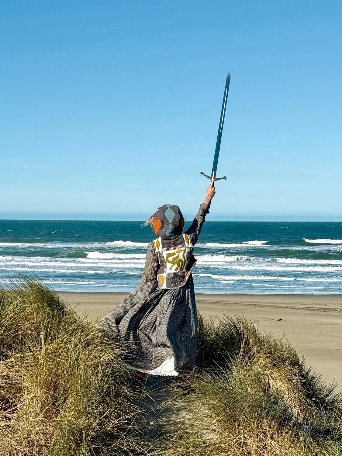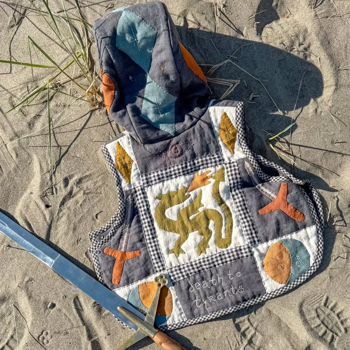 a digital sewing pattern inspired by chainmail hoods, helmets, and heraldry-adorned tabards worn by knights of ye olde times, but made of soft, squishy, warm quilted fabric.